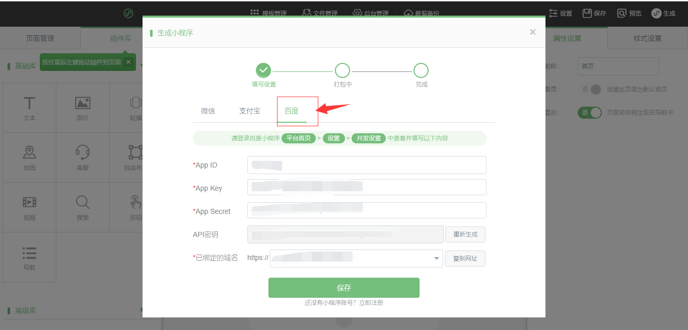 在网站后台点击生成 -》百度小程序 然后获取域名