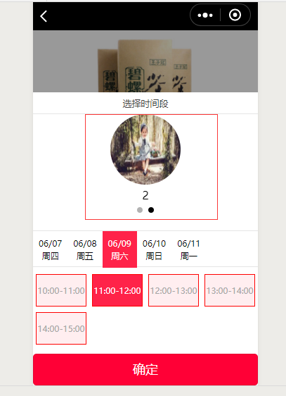 6. 在后台-小程序应用-预约,设置休息时间,保存后前台预约时间段内休息时间灰度显示,点击出现休息提示语,样式如下图:
